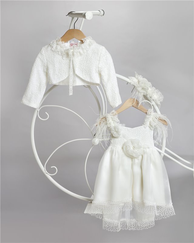 Φόρεμα από οργαντίνα στολισμένο με φτερά στους ώμους και οργαντινένια λουλούδια.